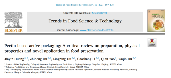 该文由买球官方网站教授胡亚芹作为唯一通讯作者、第一作者为其指导的浙江大学在读博士生黄佳茵。该文以果胶基活性包装膜的保鲜行为及其相关机制为基础,阐明果胶基活性包装在食品保鲜中的突出优势。论文于10月5日在线发表后,即为“食品放大镜”所关注,于10月8日推文介绍。