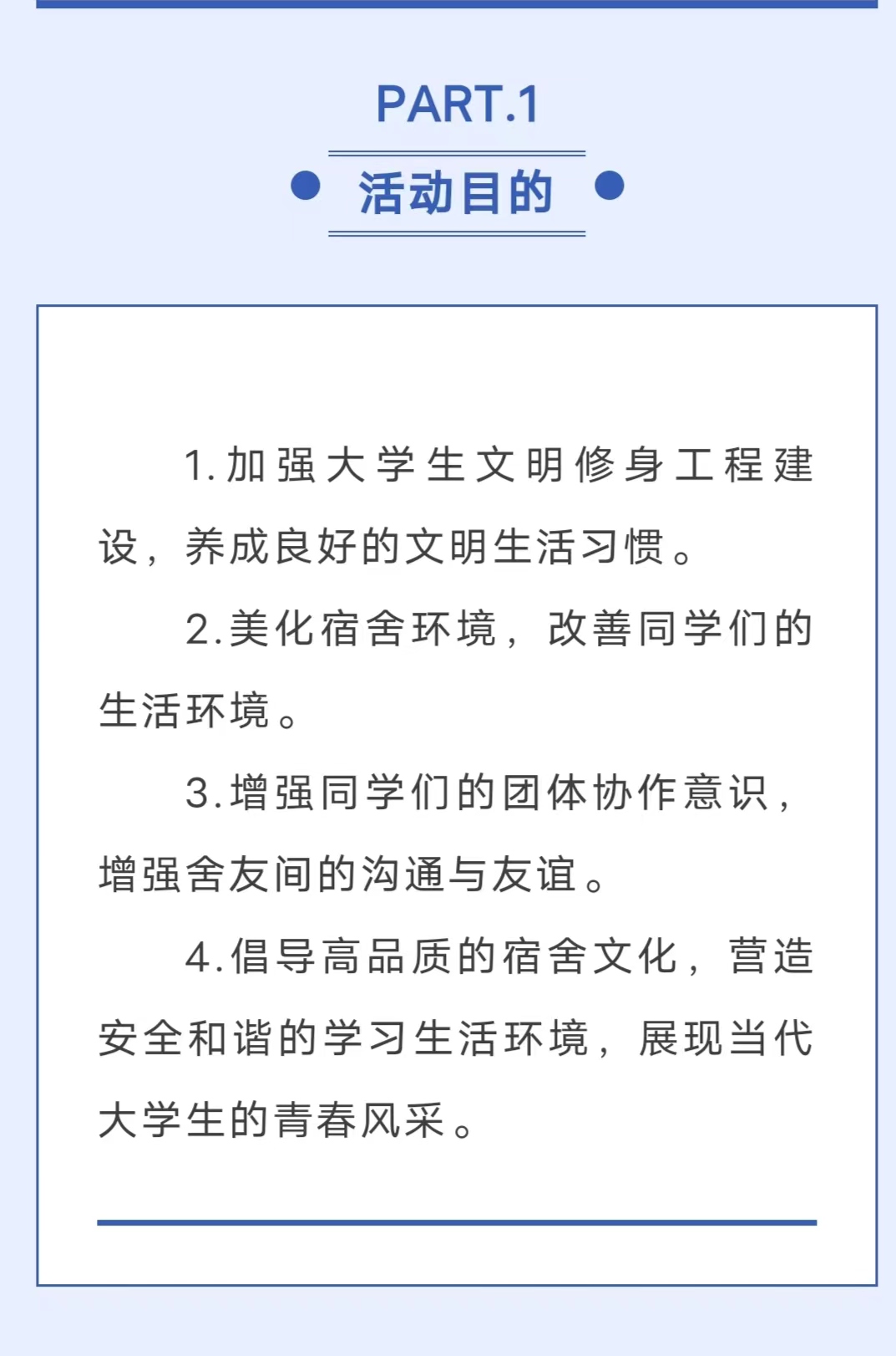 为进一步加强学生文明修身工程建设,让学生在注重个人文明修身的同时,养成良好的文明生活习惯,增强学生的凝聚力和创造力,形成具有浓郁文化氛围的宿舍环境。买球官网拟定于2023年11月1日-11月9日开展大学生“文明修身工程”文明宿舍评比活动。